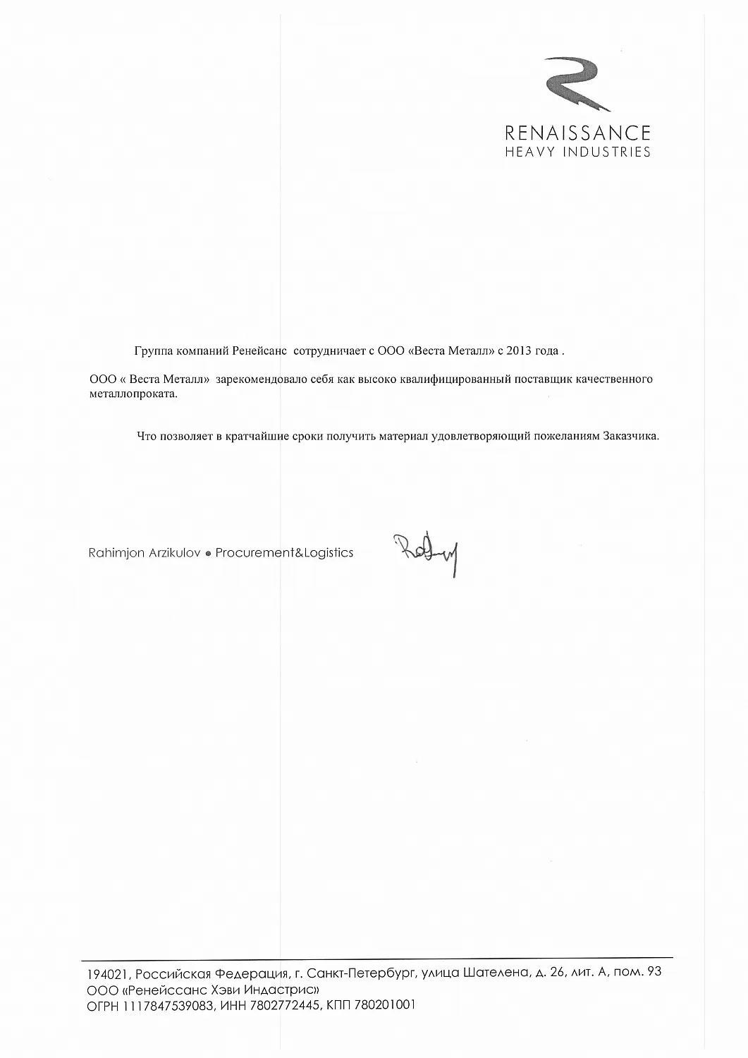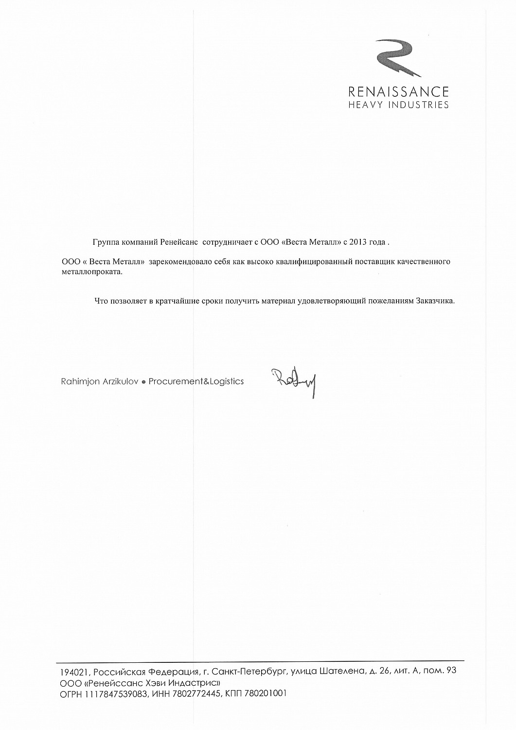 Группа компаний Ренейсанс сотрудничает с ООО «Веста Металл» с 2013 года.