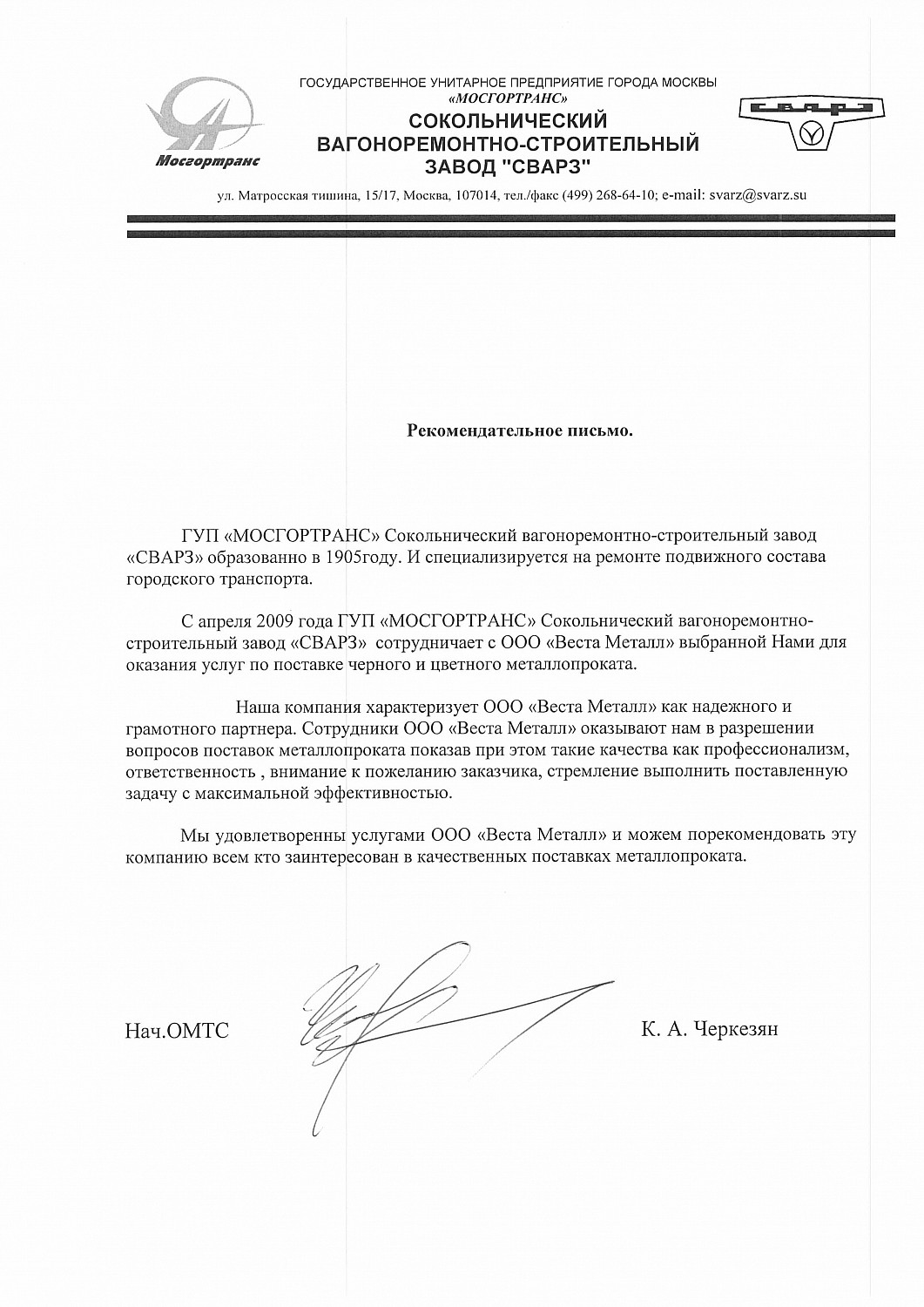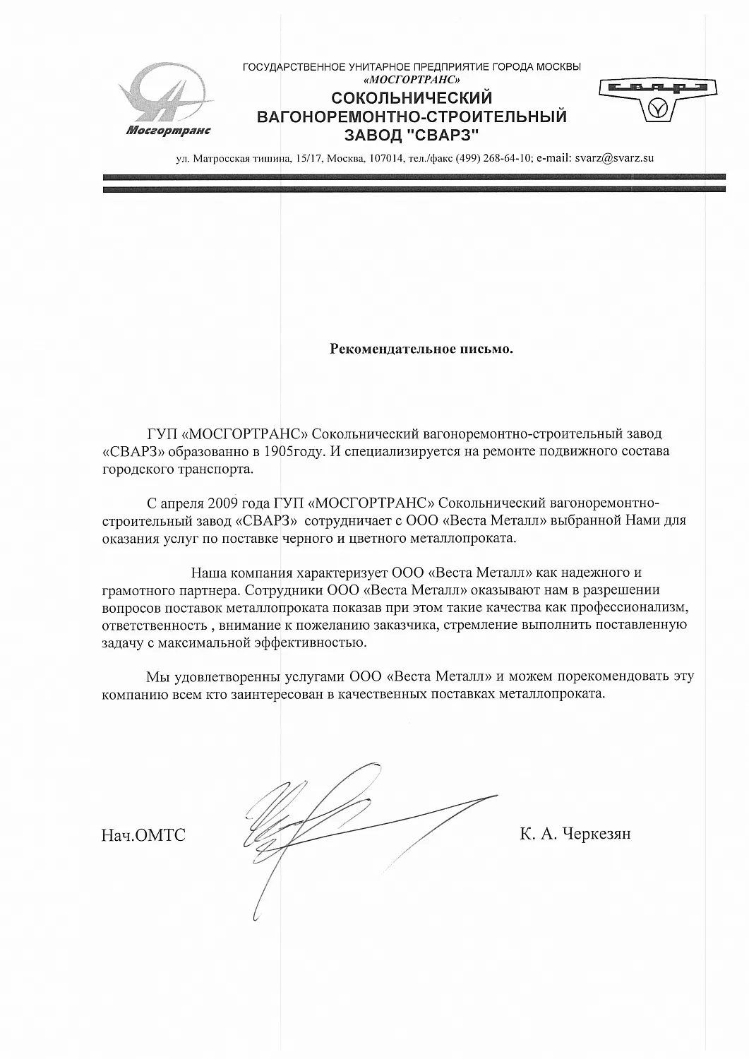 С апреля 2009 года ГУП "МОСГОРТРАНС" Сокольнический вагоноремонтно-строительный завод "СВАРЗ" сотрудничает с ООО "Веста Металл" выбранной Нами для оказания услуг по поставке черного и цветного металлопроката.