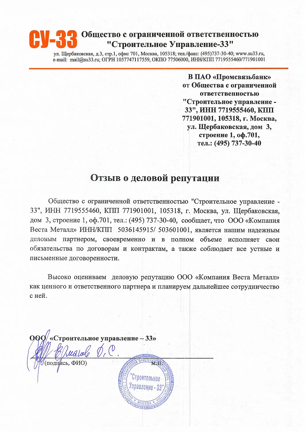 Общество с ограниченной ответственностью "Строительное управление - 33", ИНН 7719555460, КПП 771901001, 105318, г.Москва, ул.Щербаковская, дом 3, строение 1, оф.701, тел.:(495)737-30-40, сообщает, что ООО "Компания Веста Металл" ИНН/КПП 5036145915/ 503601001, является нашим надежным деловым партнером, своевременно и в полном объеме исполняет свои обязательства по договорам и контрактам, а также соблюдает все устные и письменные договоренности.