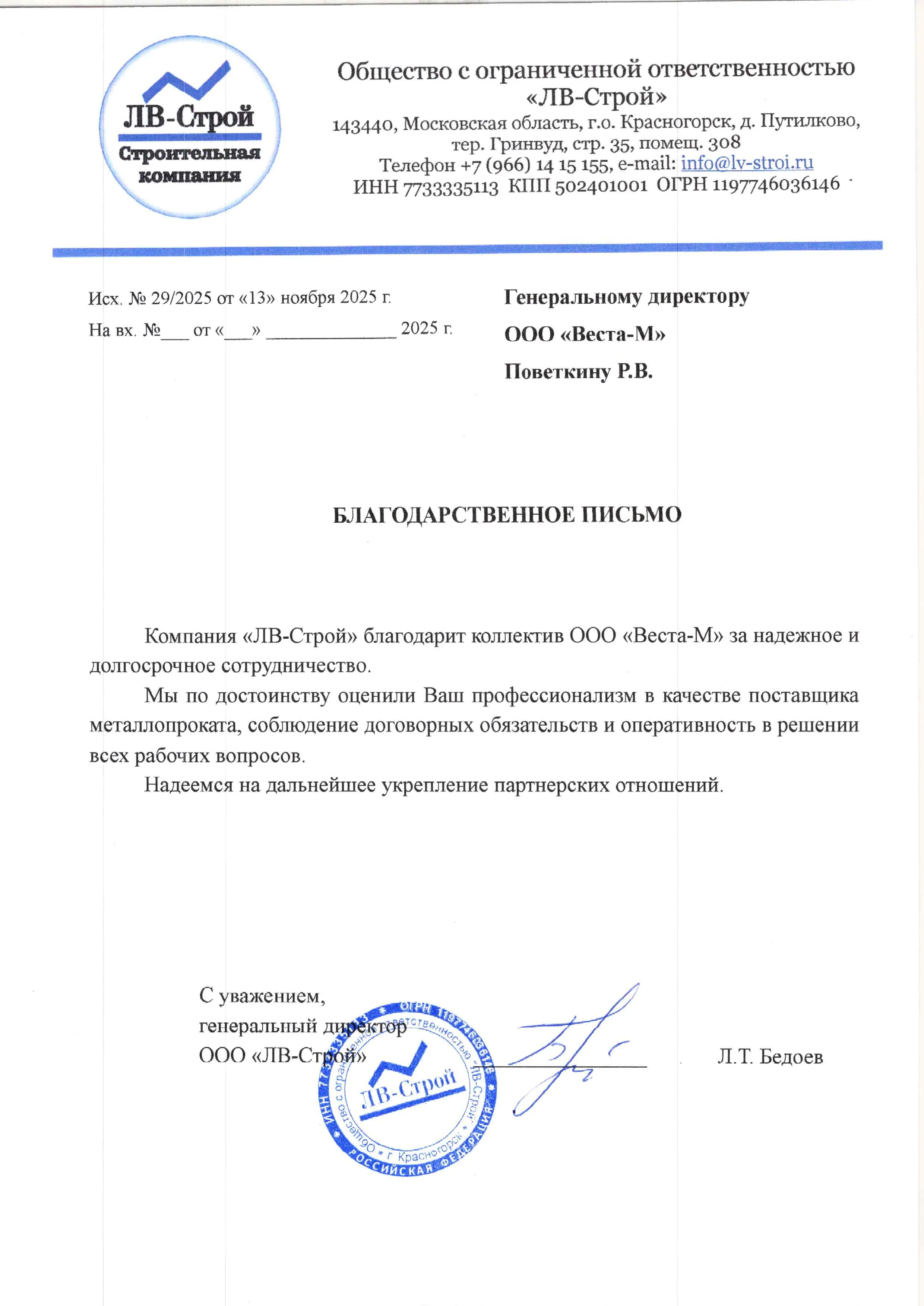Компания «ЛВ-Строй» благодарит коллектив ООО «Веста-М» за надежное и долгосрочное сотрудничество.