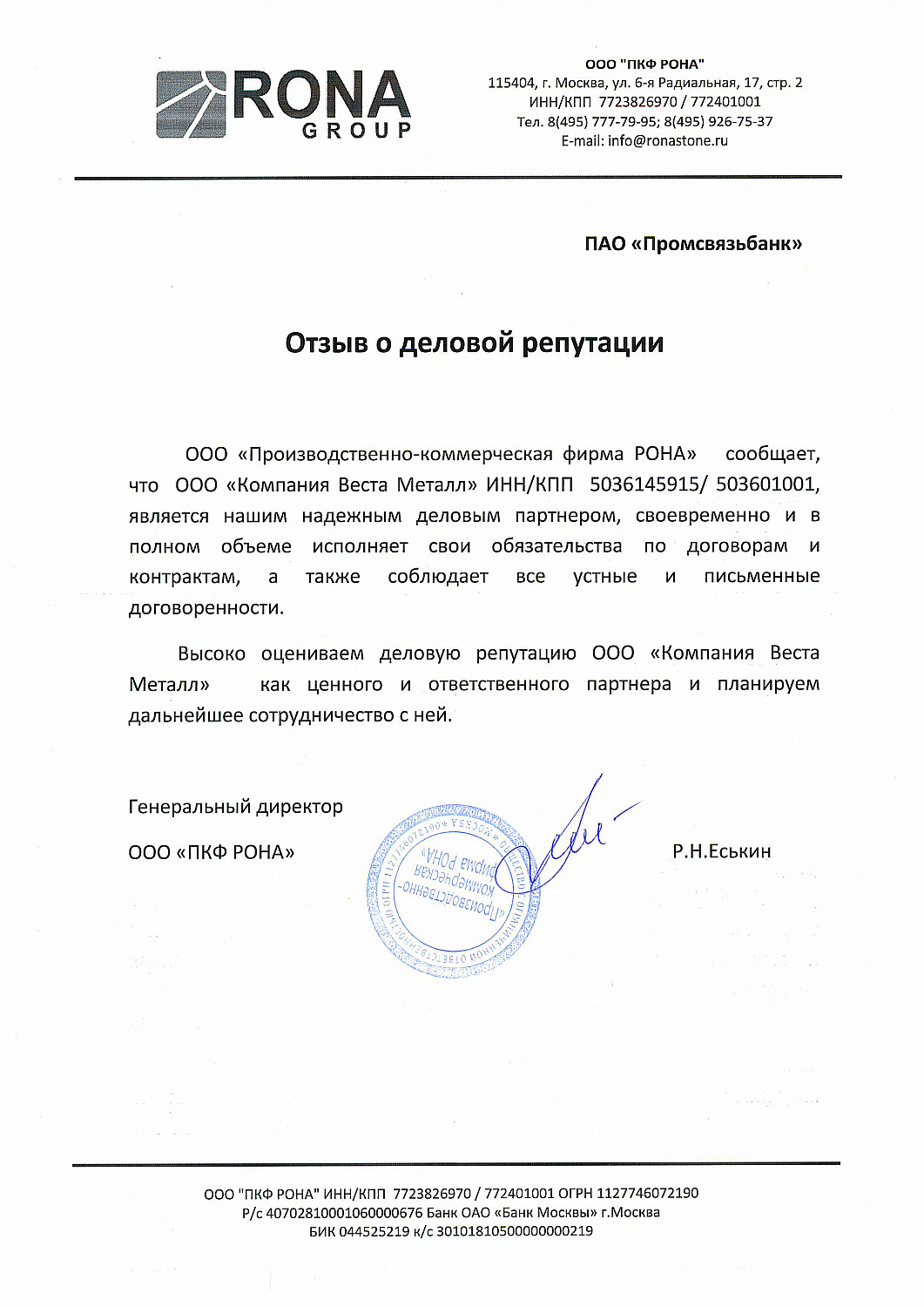 ООО "Производственно-коммерческая фирма РОНА" сообщает, что ООО "Компания Веста Металл" ИНН/КПП 5036145915/ 503601001, является нашим надежным партнером, своевременно и в полном объеме исполняет свои обязательства по договорам и контрактам, а также соблюдает все устные и письменные договоренности.