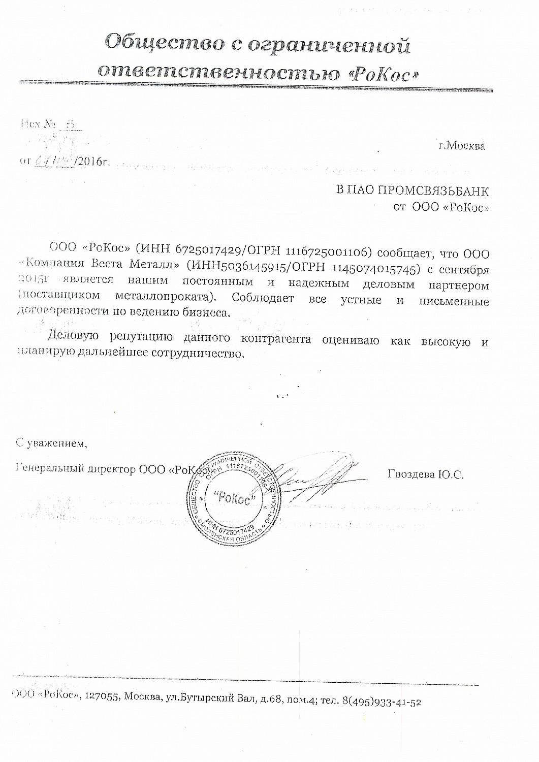 ООО "РоКос" (ИНН 6725017429/ОГРН 1116725001106) сообщает, что ООО "Компания Веста Металл" (ИНН5036145915/ОГРН 1145074015745) с сентября 2015г. является нашим постоянным и надежным деловым партнером (поставщиком металлопроката). Соблюдает все устные и письменные договоренности по ведению бизнеса.